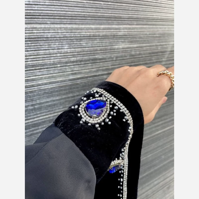 چادر جده مچ مخمل و جواهر دوزی شده سنگ کاری و جواهر دوزی کار دست و مزون دوزی بسیار تمیز و شیک مخمل مرغوب و با کیفیت چادر در دو جنس کرپ و کن کن ندا مشکی هست و بور نیست پرز نمیگیره دوخت بسیار تمیز در همه سایز ها